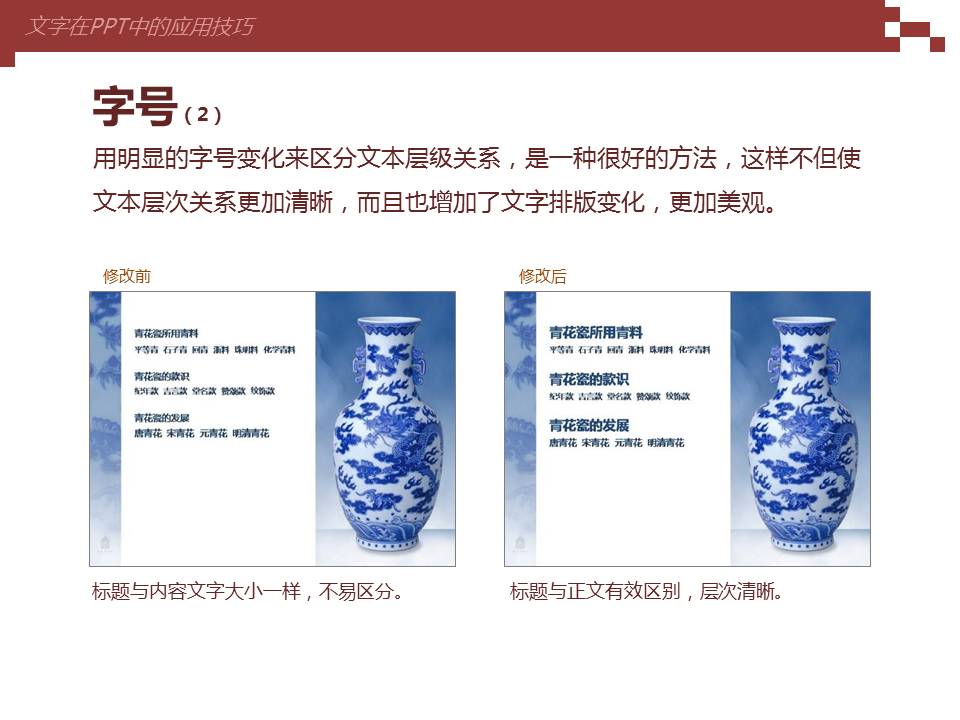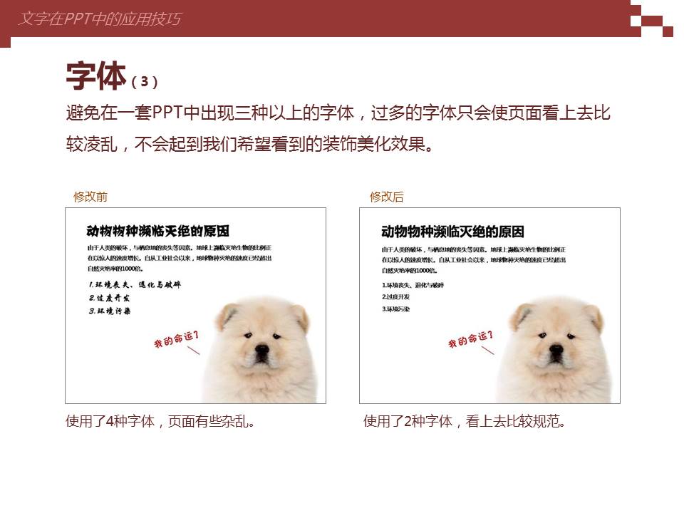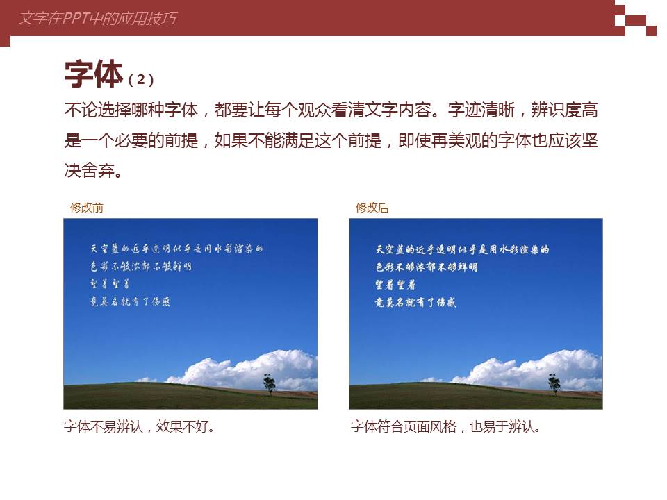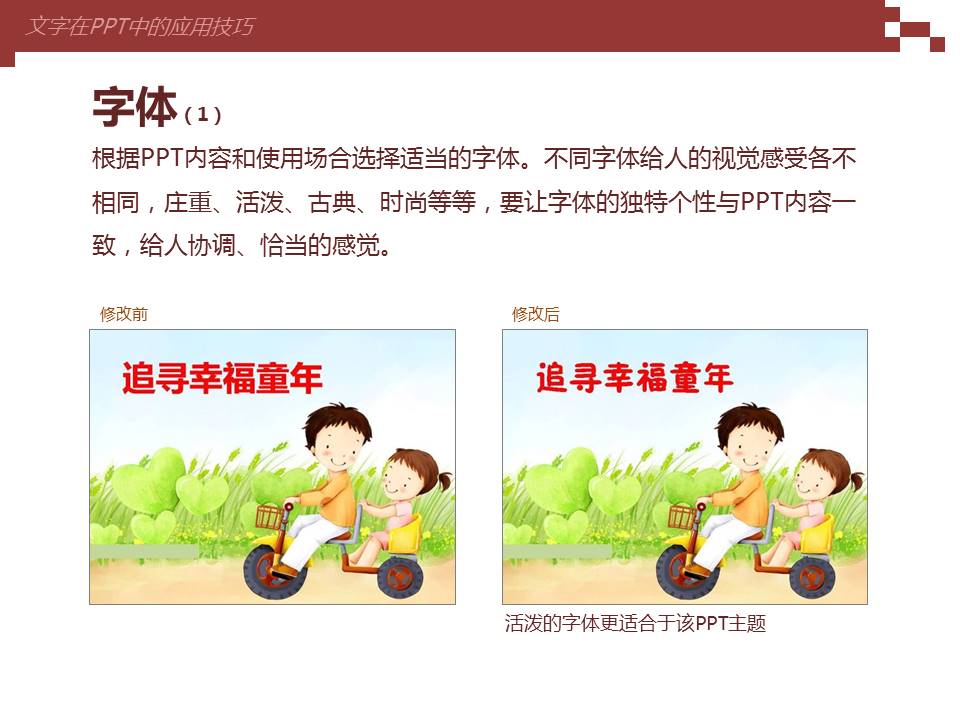 :文字在PPT中的应用技巧,字体:根据PPT内容和使用场合选择适当的字体。不同字体给人的视觉感受各不相同,庄重、活泼、古典、时尚等等,要让字体的独特个性与PPT内容一致,给人协调、恰当的感觉。