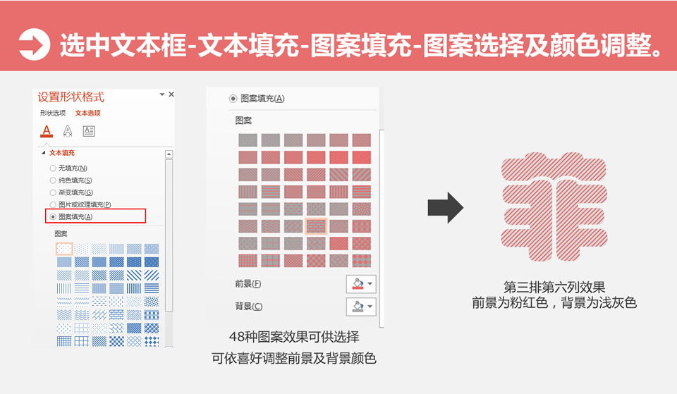 :文字图案填充,选中文本框,文本填充,图案填充,图案选中及颜色调整。