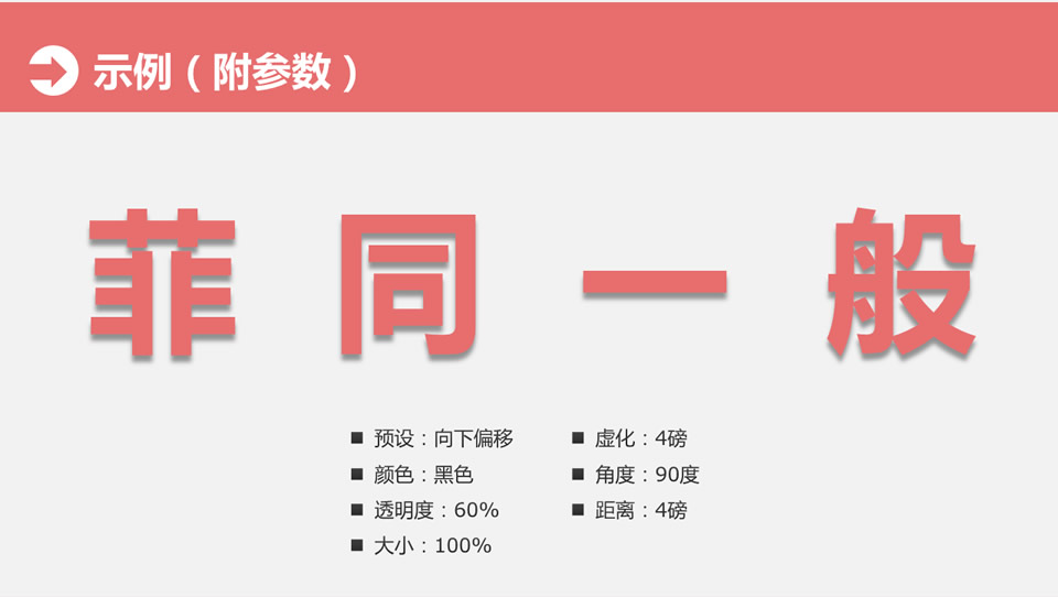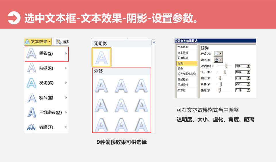 :文字阴影设置之外部阴影,选中文本框——文本效果——阴影——设置参数。