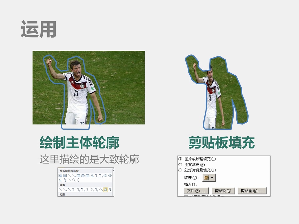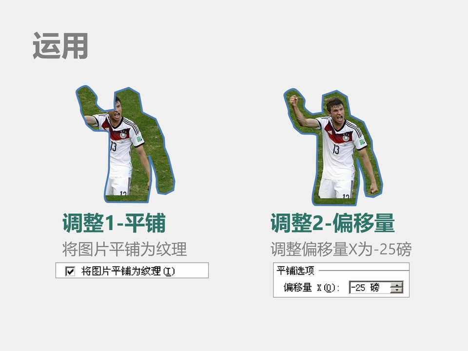 :运用:绘制主体轮廓,这里描绘的是大致轮廓,剪贴板填充,调整1-平铺,将图片平铺为纹理,调整2-偏移量,调整偏移量X为-25磅。