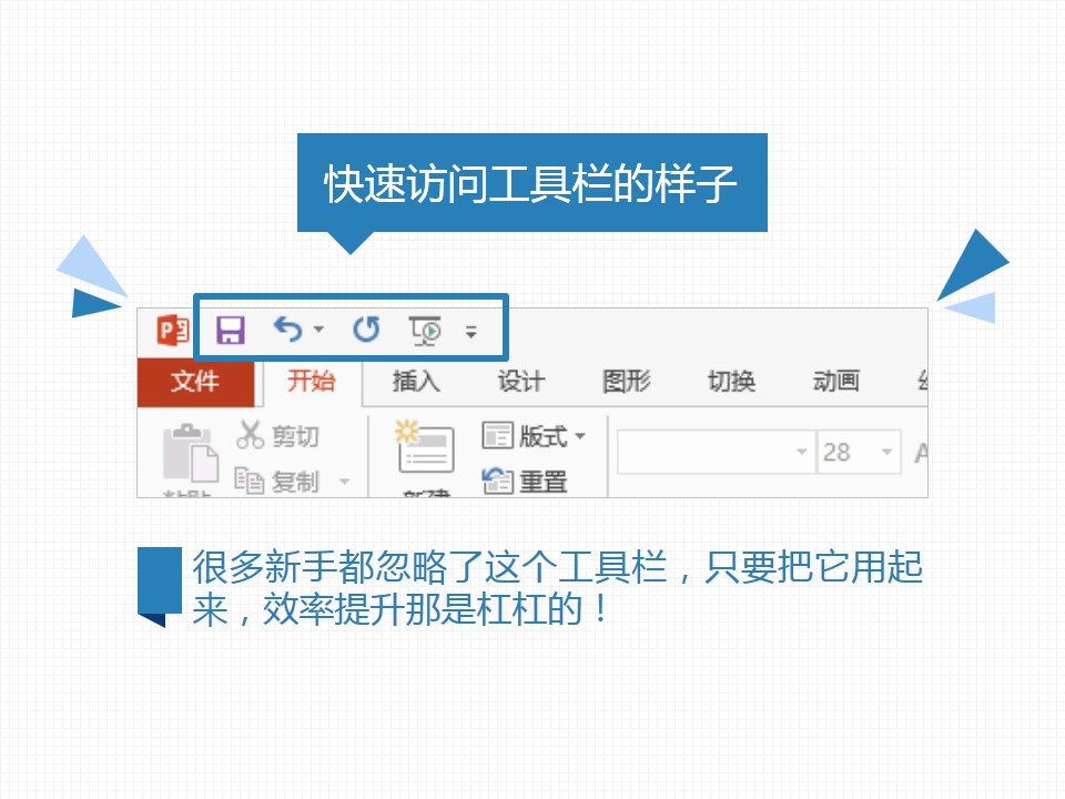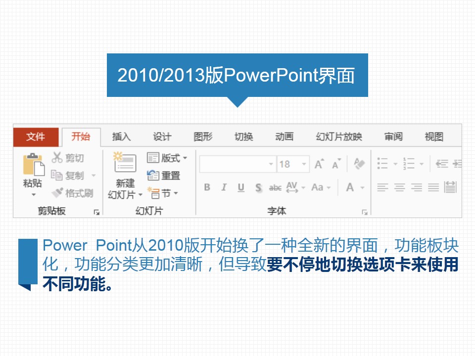 :高手使用PPT特殊技巧,2010/2013版PowerPoint界面,PowerPoint从2010版开始换了一种全新的界面,功能板块化,功能分类更清晰,但导致要不停地切换选项卡来使用不同功能,ppt高手使用技巧@嘉文钱ppt教程... ...