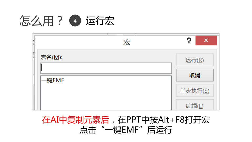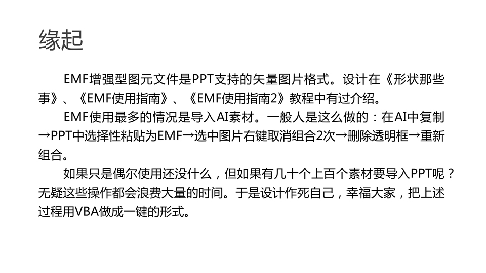 :EMF增强型图元文件是PPT支持的矢量图片格式。设计在《形状那些事》、《EMF使用指南》、《EMF使用指南2》教程中有过介绍。EMF使用最多的情况是导入AI素材。一般人是这么做的:在AI中复制→PPT中选择性粘贴为EMF→选中图片右键取消组合2次→删除透明框→重新组合。