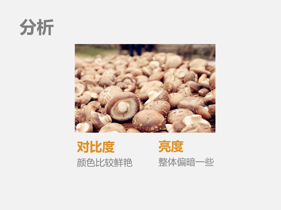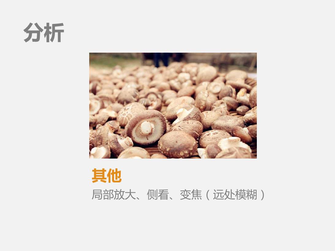 :菇为例分析,对比度,颜色比较鲜艳,亮度,整体偏暗一些,分析,其他,局部放大,侧看,变焦(远处模糊),ppt图片特殊效果实现教程。