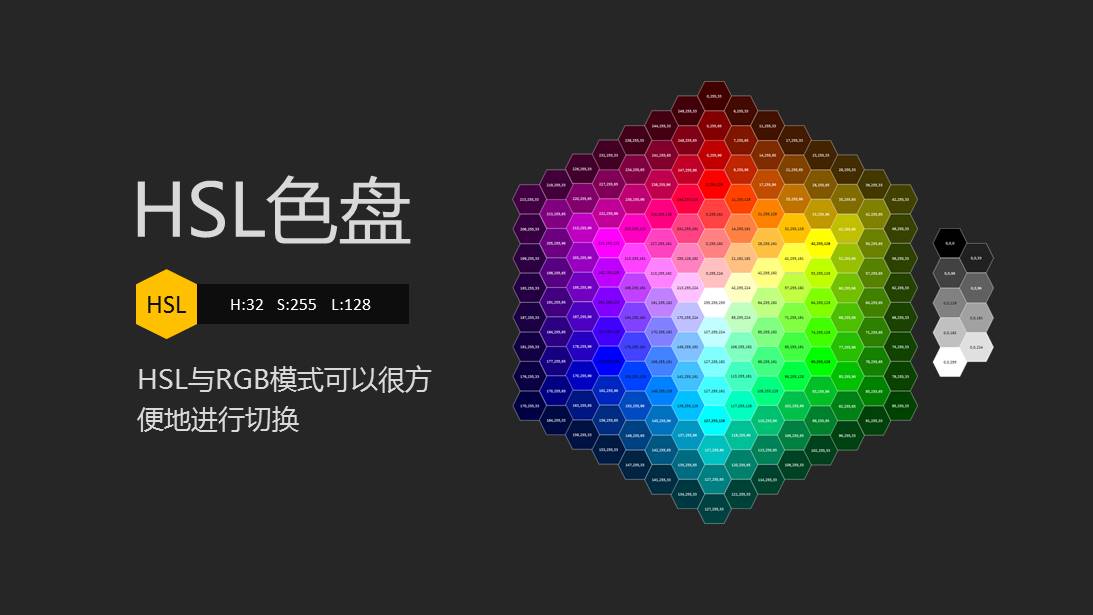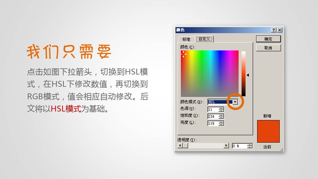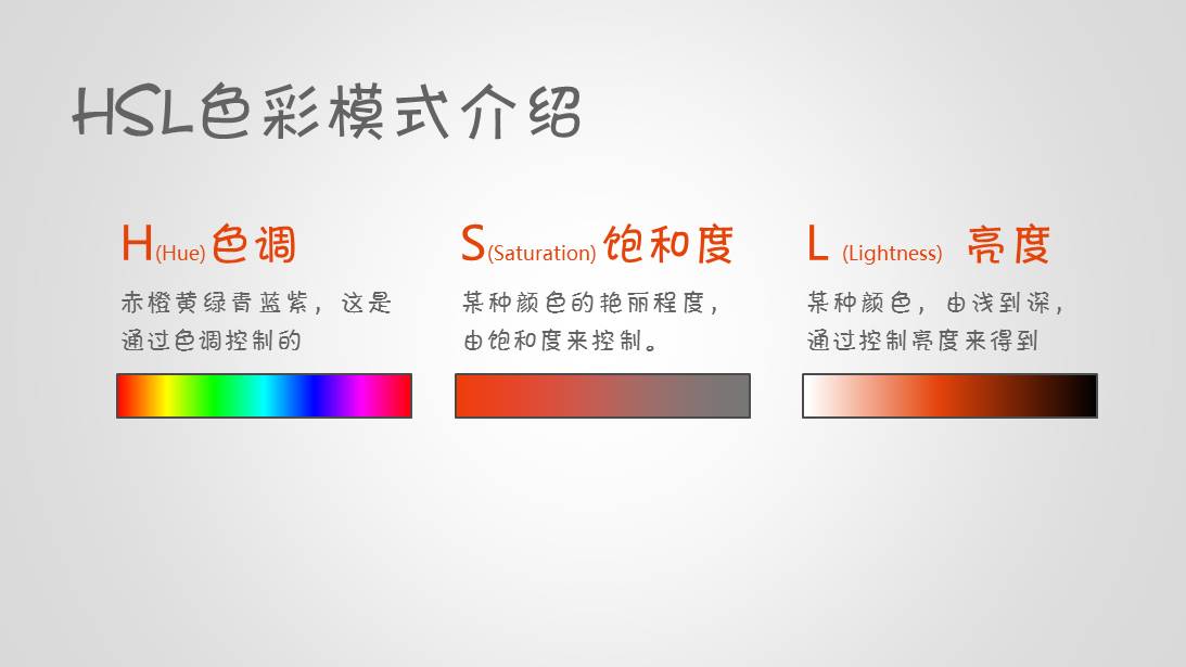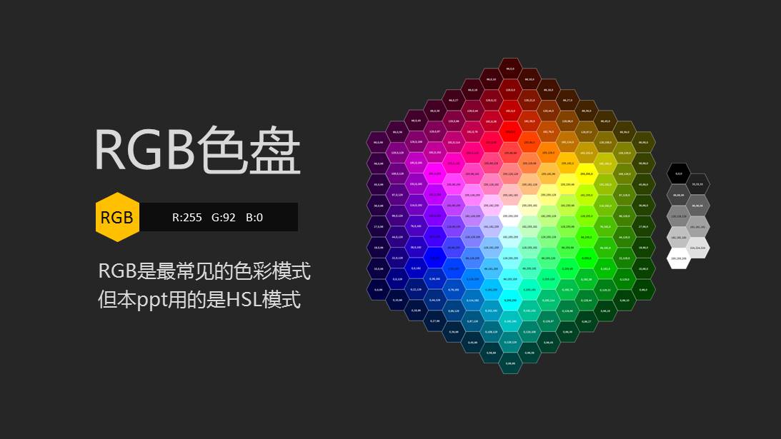 :RGB色盘:RGB是最常见的色彩模式,但本ppt用的是HSL模式。HSL色盘:HSL与RGB模式可以很方便地进行切换。我们只需要点击如图下拉箭头,切换到HSL模式,在HSL下修改数值,再切换到RGB模式,值会相应自动修改。后文将以HSL模式为基础... ... 漫谈PPT色彩——ppt配色教程下载。