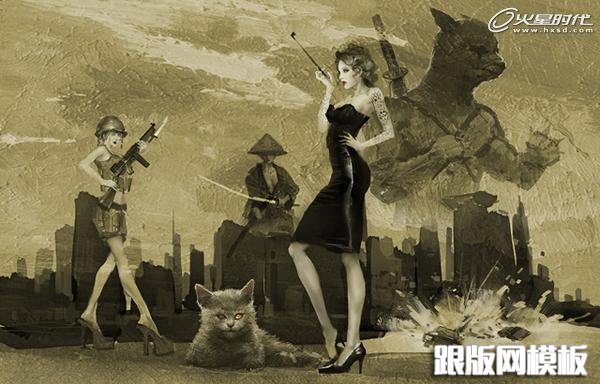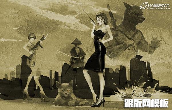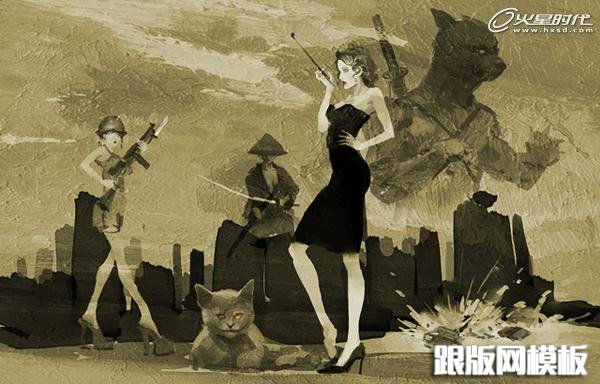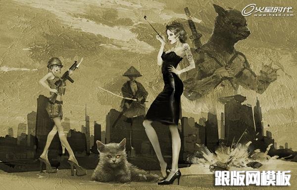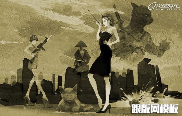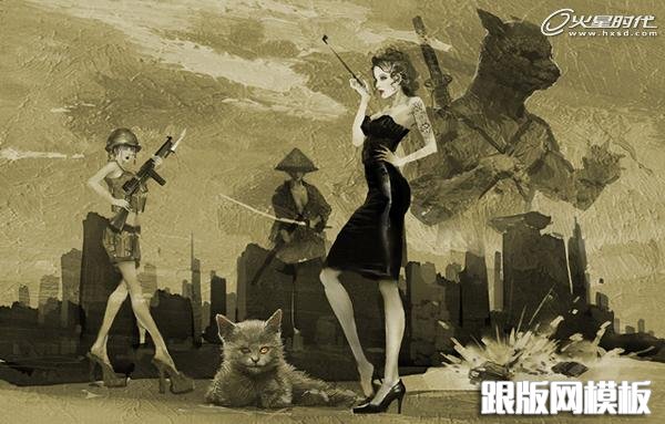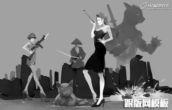 4、刻画女武士和前景的猫,把猫的脸部表情画得邪恶一些。