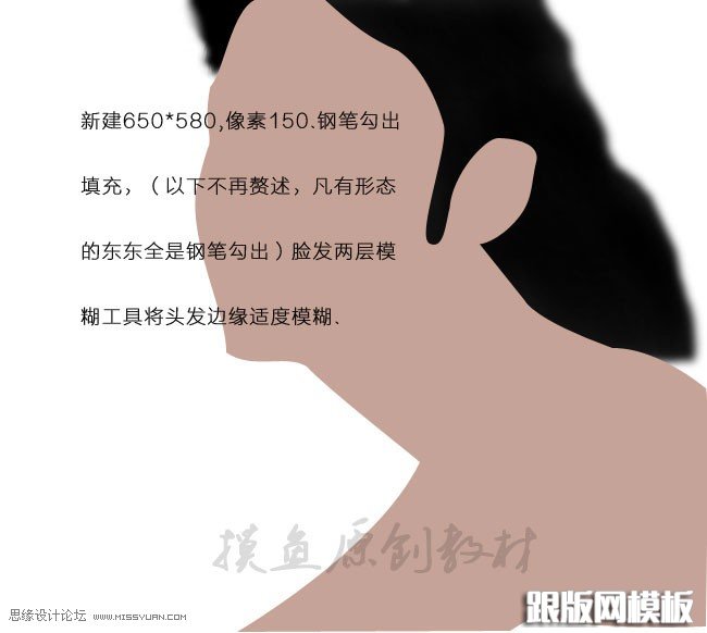 1、新建一个650 * 580 像素的文档,画布分辨率为150像素。新建一个图层,用钢笔勾出人物轮廓并填充肤色颜色。新建一个图层,用钢笔勾出头发部分的选区,填充黑色,用模糊工具把头边缘适当模糊处理,效果如下图。
