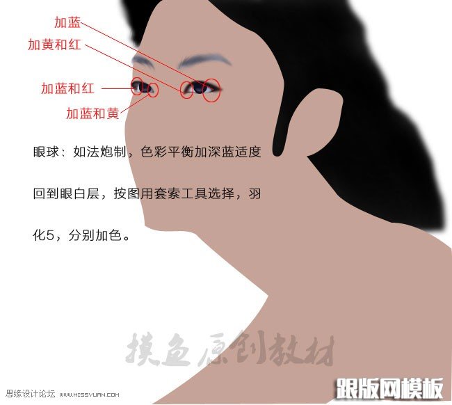 4、眼球制作方法一样,需要用色彩平衡加深蓝,回到眼白层,用套索工具选区下图红圈所示的区域,分别加上相应的颜色。