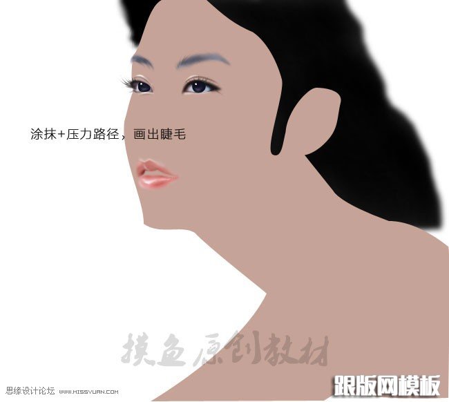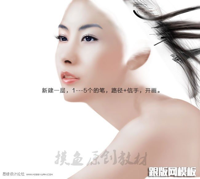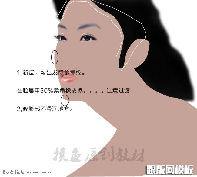 8、新建一个图层,用钢笔勾出发际参考线,在脸层用30%的柔角橡皮擦,注意过渡。然后再修整脸部边缘不润滑的地方。