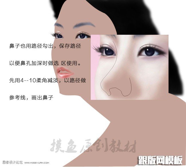 9、鼻子也用路径勾出,保存路径以便鼻孔加深时做选区使用。先用4 - 10柔角减淡工具减淡,用路径做参考线画出鼻子。