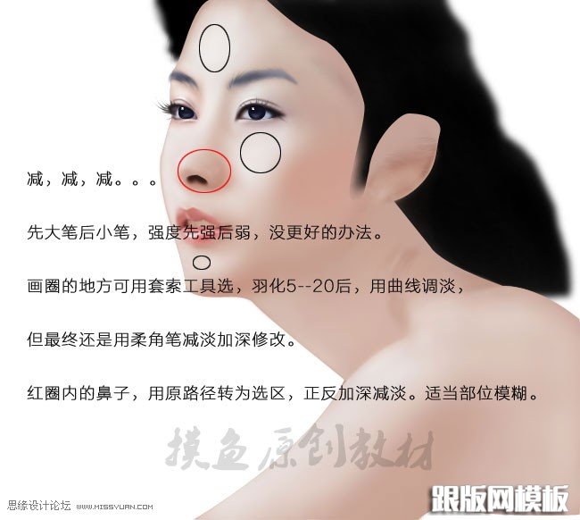 红圈内的鼻子,用原路径转为选区,正反加深减淡,适当部分模糊。