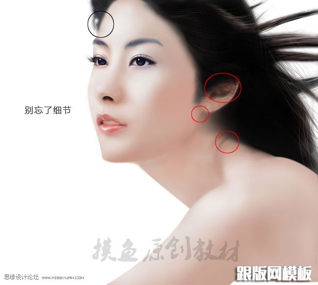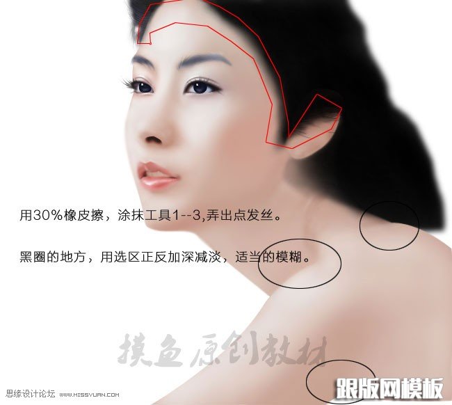 11、用30%橡皮擦,涂抹工具涂出发丝。黑圈的地方用选区正反加深减淡,并适当模糊处理。
