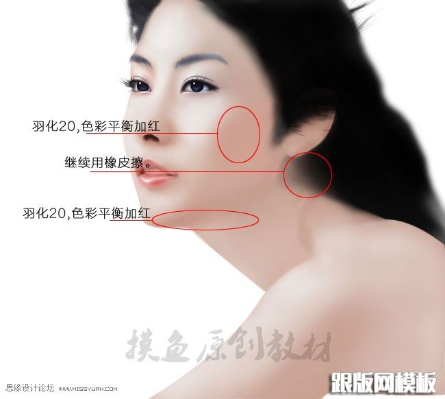 10、脸部的高光部分处理:先用大笔后小笔,强度先强后弱。画圈的地方可用套索工具选取后羽化3 - 20个像素,用曲线调淡。但最终还是用柔角笔减淡加深修改。