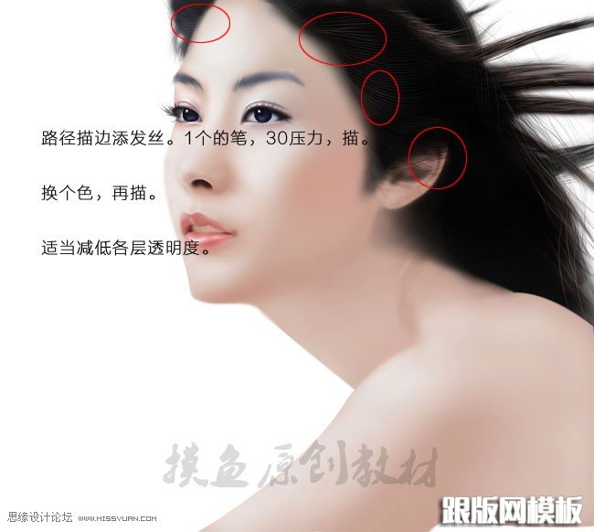 16、新建图层,用路径描边添加发丝,效果如下图。