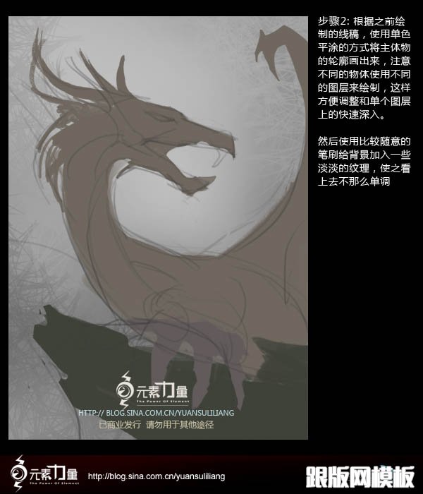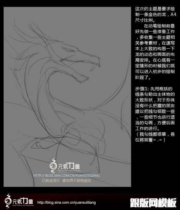 在动笔绘制前最好先做一些准备工作,多收集一些主题相关参考素材,在速写本上大致的构思一下龙的动态和画面的布局安排。在心底有一定雏形的时候我们就可以进入初步的绘制阶段了。