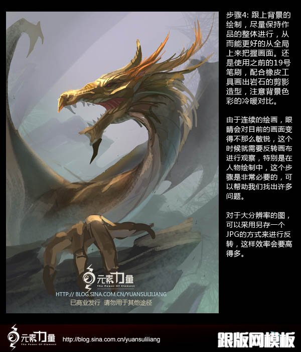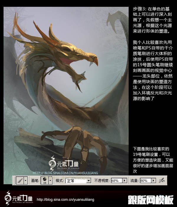 我个人比较喜欢先用喷笔和PS自带的干介质笔刷进行大体积的涂抹,后使用PS自带的19号圆头笔刷继续刻画画面的视觉中心--龙头部分。依然是使用块面的塑造方法,在这个阶段可以加入环境反光和次光源的影响。