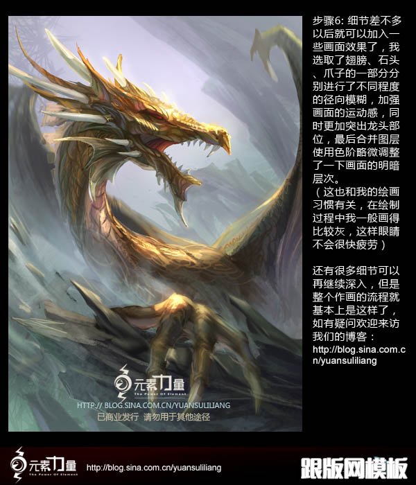 6、细节差不多以后就可以加入一些画面效果了,我选取了翅膀、石头、爪子的一部分分别进行了不同程度的径向模糊,加强画面的运动感,同时更加突出龙头部位,最后合并图层使用色阶略微调一下画面的明暗层次。