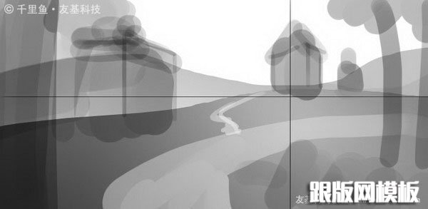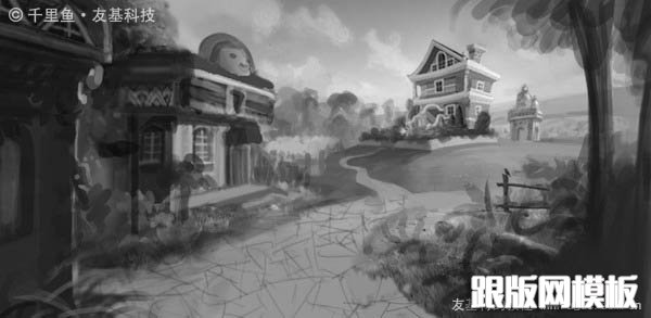 2、大致布局完成了,开始将它们细化。因为这张图色彩关系较复杂,直接上色不好掌握,所以前期我们先画黑白稿。通常黑白稿画起来会比较轻松,因为不用考虑色彩关系,造型上可以轻松变化,直到满意。