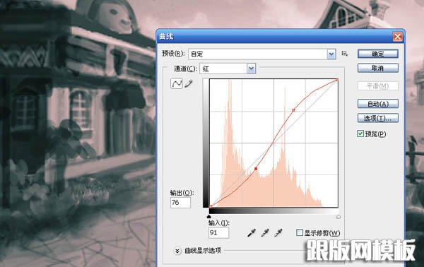 用曲线工具调整整个画面的冷暖关系。这张图我准备画成夕阳西照的感觉,亮部会明显的偏暖,暗部则偏冷。于是我用曲线工具,对红色通道做了以下调整。