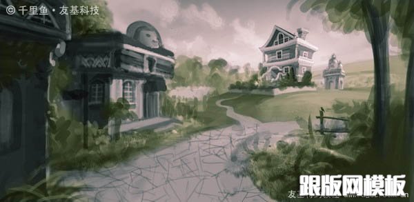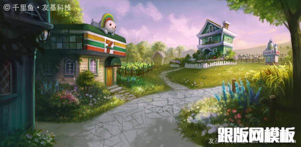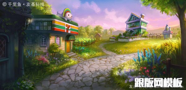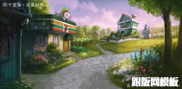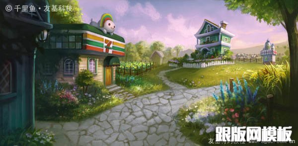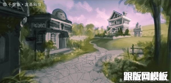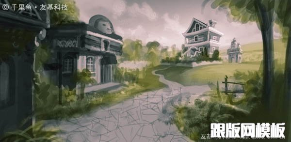 16、几天以后,我重新审视这张图,发现左边两栋房子中间的小路不太合理,于是我把它去掉,取而代之以茂盛的花草,并将左边小屋的结构做了调整,让它看起来更科学更有情调。当一个东西放在画面边角不重要的地方时,我们常常对它不够用心,实际上它的剪影也能给观者带来更宽广的想象。另外,我感觉小路上的树影不够明确,于是我给树影做了选区,对它的形状进行了更加明确的概括。好的,一张满意的图终于跃然眼前啦!