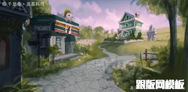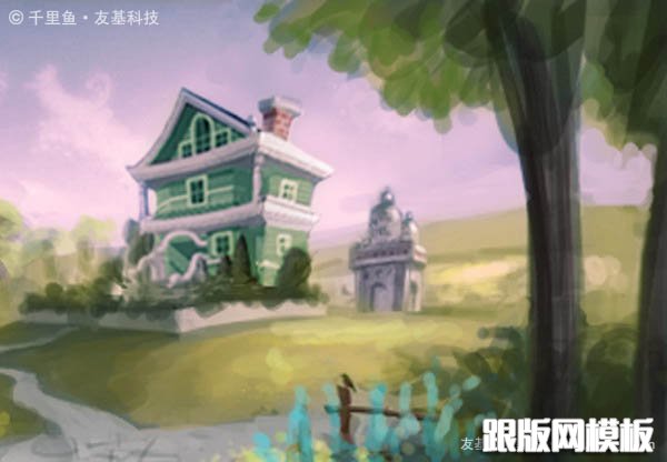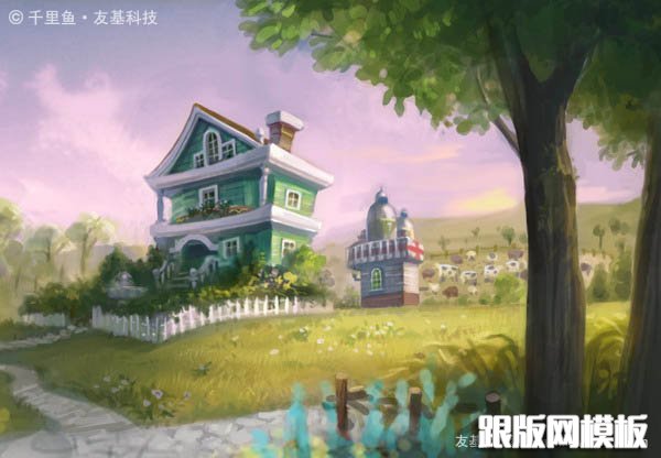 有朋友认为画面右边的树太挡视线了,把它移开些可能会让视野更开阔,我试着改了下,效果是好些,我采纳了他的建议,并且利用挪开的空间把小洋楼后面的牧场画的更精彩了。