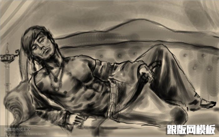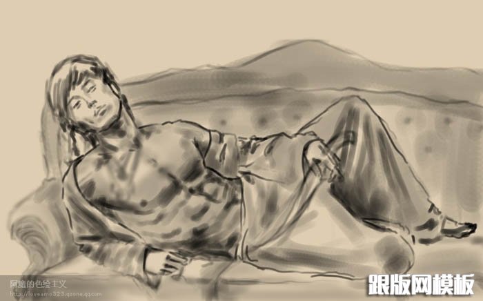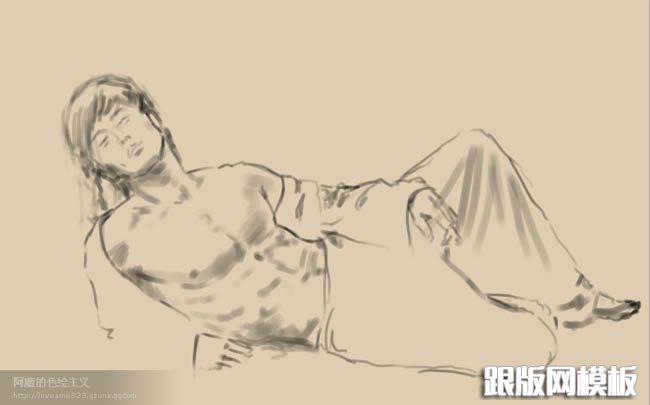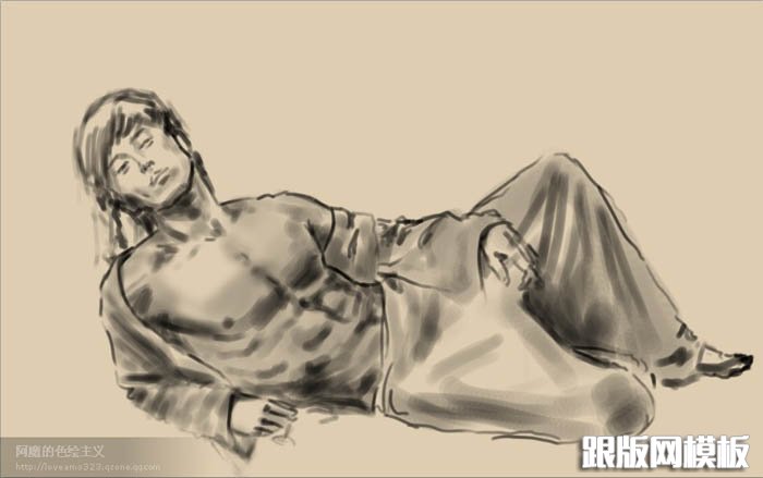 1、新建一个大小适当的文档,背景填充淡褐色。新建一个图层描出人物大体轮廓。