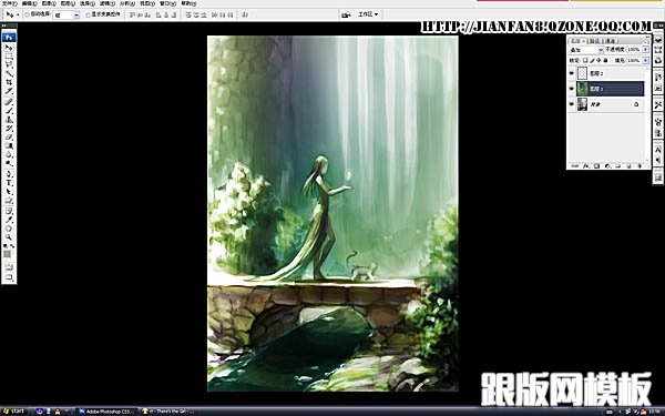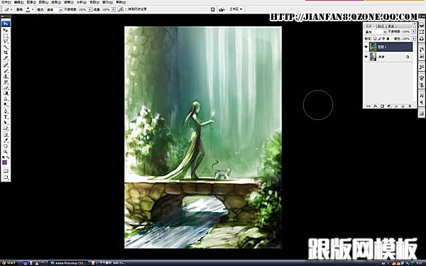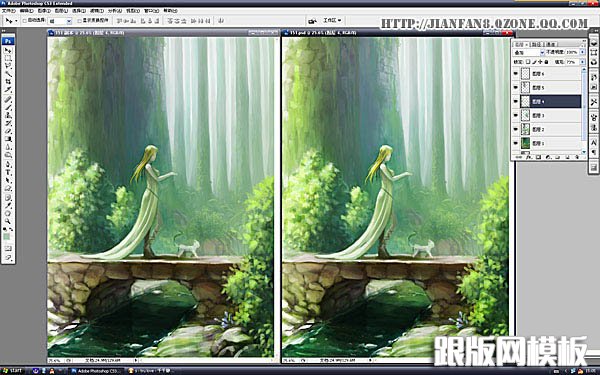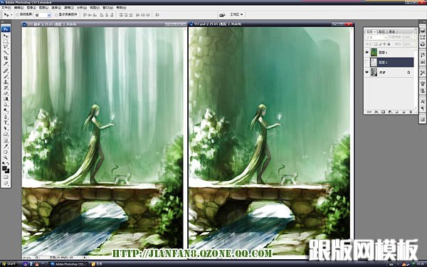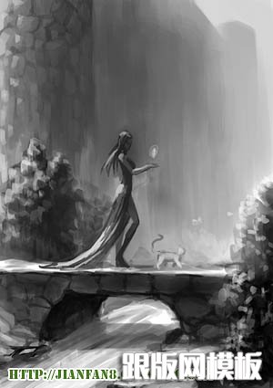11、缩小视图,重新审视,加强对比,右边的图是重新改过的,有什么变化?对比一下前后远近,主要更改的部位是左上角墙上的部位变浅。让墙壁远去些,和墙下面离人物最近的树丛分开。深浅不同,远近也会不同,让空间感更强些。虽然己经到了细画阶段,但仍然要常常停下缩小视图审查一下画面。一味的细画到底会把画面画死。注意自己细画的东西会不会跳脱画面。