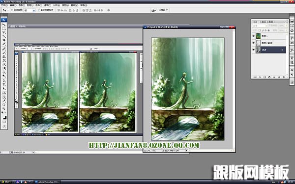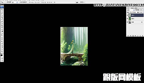 3、画着画着,觉得后面那堵墙太堵气了,画面太压了。不透气。又新建了一层把背景改画成树林。这时就要多构成多对比。当你觉得这个想法有问题或是错的时候就不要一根筋的死画下去,要马上放掉它。改了它。以下两种想法的对比。