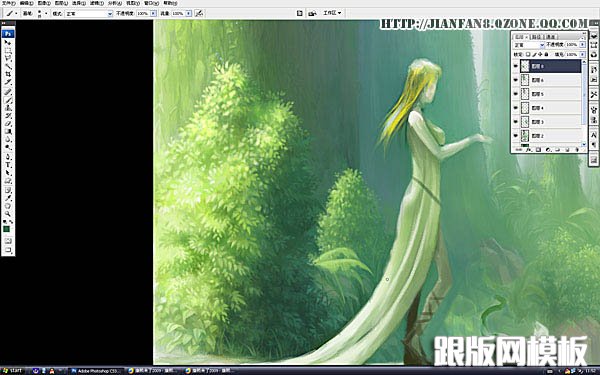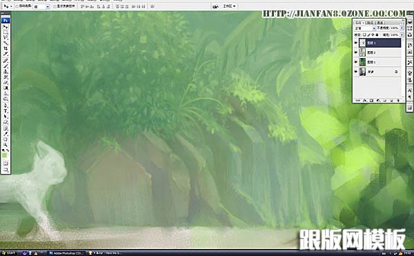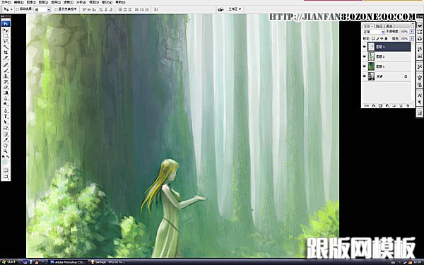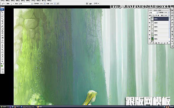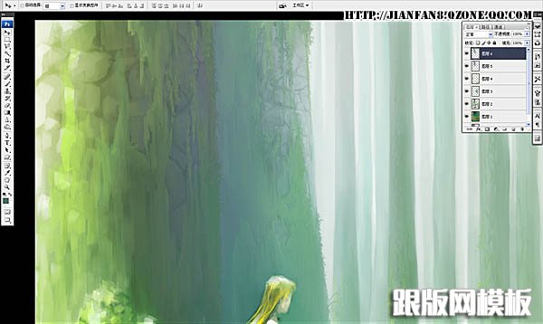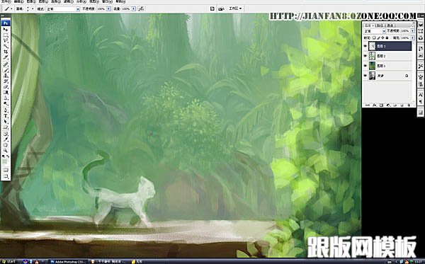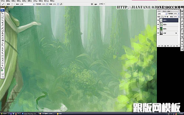 回正题,放大画面,在刚刚缩小的视图中画好的大致画面开始细节刻画。个人习惯从画面最远处画起,新建一层,开始在原色彩上修画,纵横交错的树干,每一颗的位置远近都不同,所以色彩深浅都不同,这个地方很关键,如果色彩深了就不能把整个画面的远近虚实拉开,一定要恨心点能淡就淡去。要有纵深。