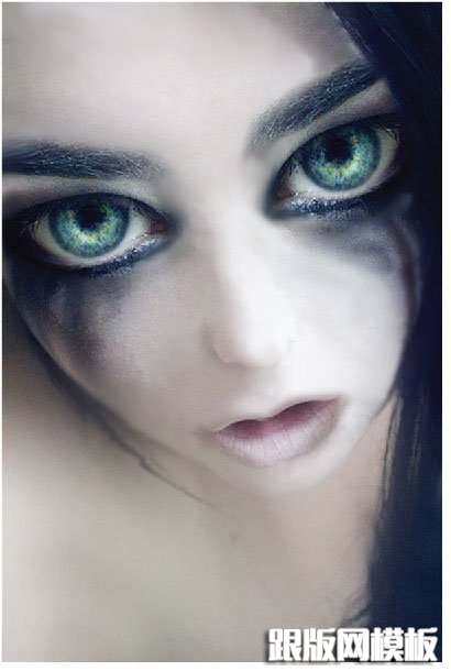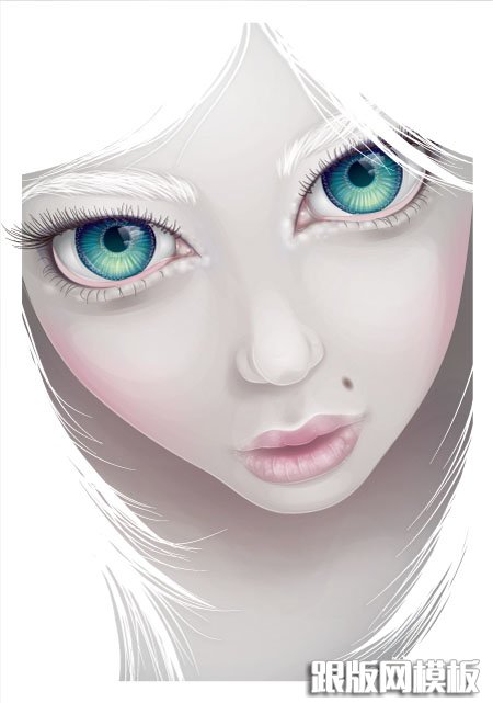 10、进一步添加透明的径向渐变和不同颜色的低透明度形状,以增加深度和眼睛的细节。我在眼睛周围使用了许多白色的径向渐变。这种方法也被使用到嘴唇周围,使其更突出。同时也柔化了一些看起来比较僵硬的线条。