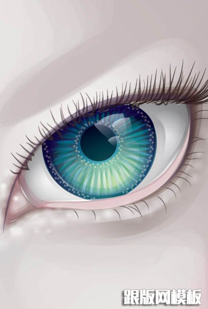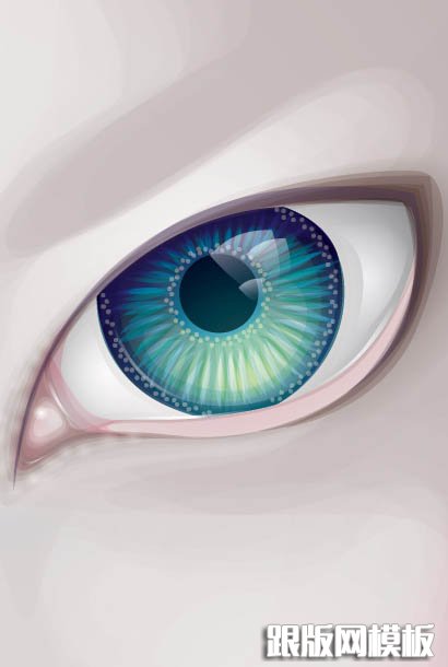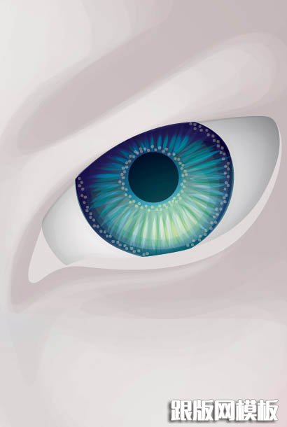 9、现在添加透明的径向渐变,笔刷描边和点,以增加眼睛的细节。我使用各种混合模式和不透明度,给予一个有趣的对比效果。眼内的描边使用了多种颜色,使用较低的不透明度和渐变达到不错的效果。(大家按下图试着用自己的方法画一下)