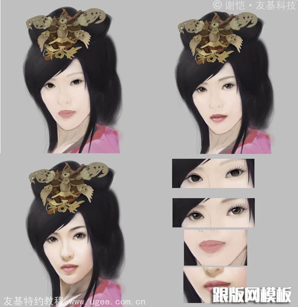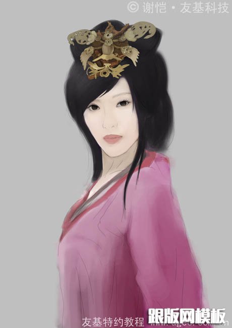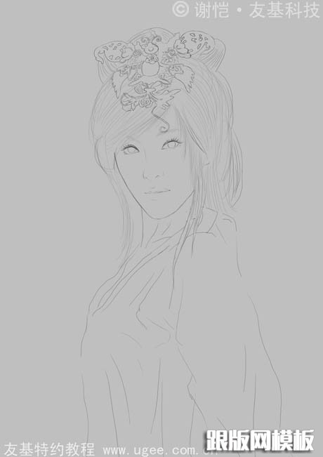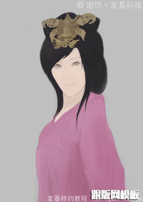 5、进行主体的明暗刻画,这个环节的重点在于体现脸部和头饰的细节,衣服方面暂时可以让它写意点。