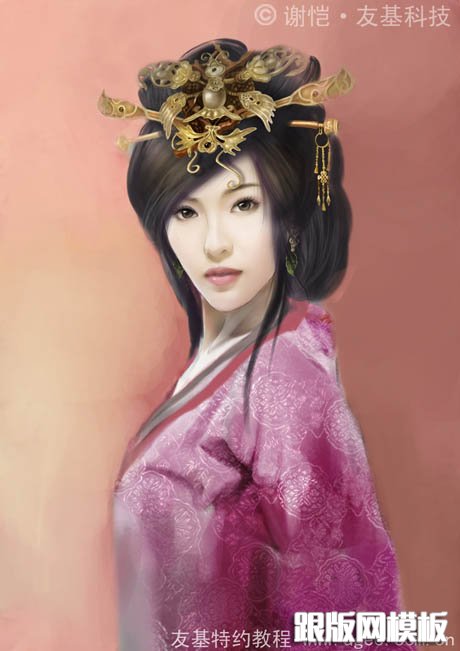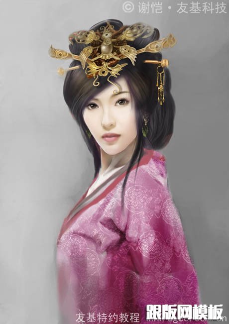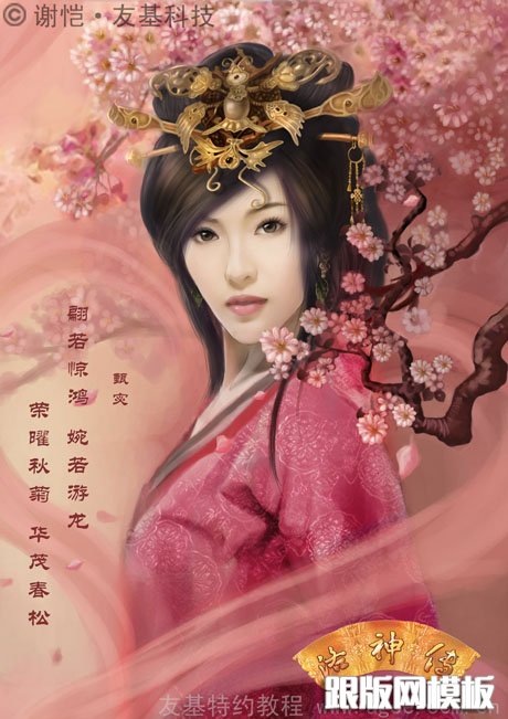 本教程的效果根据历史人物洛神来展开。在鼠绘这类人物的时候,需要对历史有一定的了解,如当时的人物流行的服装,饰品,背景建筑等。然后再慢慢展开思路,刻画出较有真实感的历史人物。