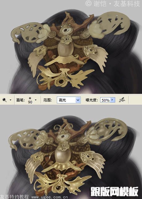 8、衣服大概完成了,我们开始对头饰进行深入刻画。选择加深减淡工具(O键,模式改为高光),将头饰的亮色给提出来。