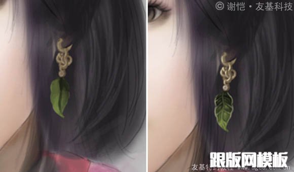 10、新建一个图层,选择画笔工具,勾勒出耳环的大致形态。再使用加深减淡工具表现出大体的感觉,然后提出耳环的亮面。在这个环节大家要记住,唯美风格的人物插画是非常注重细节的,如头饰、耳环等,所以一定要耐心刻画。