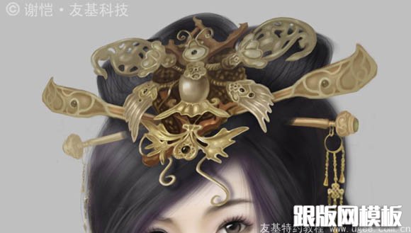 11、这里感觉头饰有点单调,于是我又给这位美女加上了4根发簪。用上述刻画耳环的方法将4根簪子完成,在这里同样要注意细节的处理。