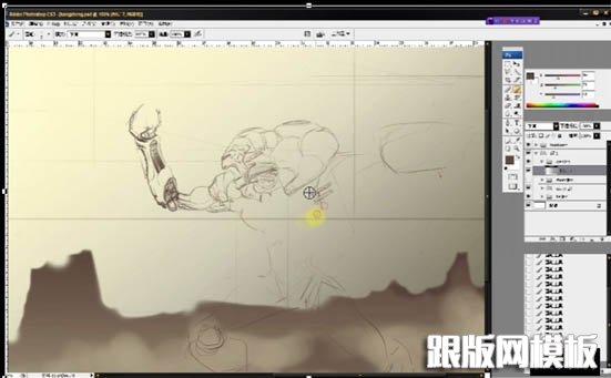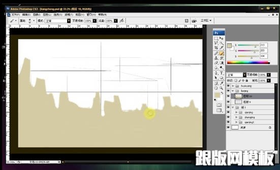 1、本作品是使用汉王创艺大师三代数位板产品完成,该产品在压感表现和读取速度上都有很好的表现首先,在ps图层面板分三个集,以前景,中景,远景(背景)予以划分在中景中以直线定下大致格局,然后以色块铺就地面轮廓。