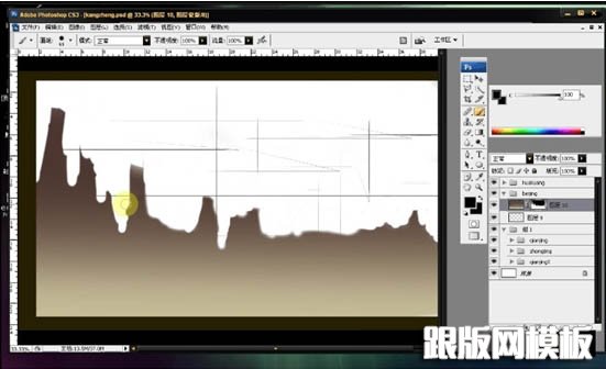 2、为了得到地面的过渡感觉,用渐变工具扑出色调套用蒙板,在蒙板上以笔刷擦掉多余颜色,又可以带出造型。