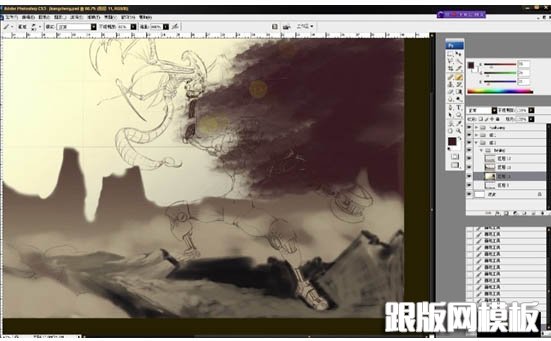 13、在远景图层上用一个云层笔刷不需要什么特别的设置就可以造出一个天空的愿景,同样一个笔刷也可以制造雾气,火球等等类似的效果。
