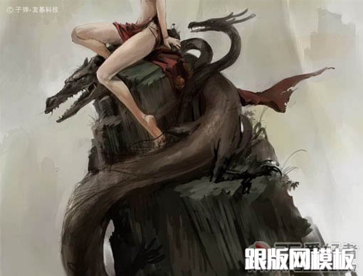 15、画出龙头,细节加上小草。加上更多的细节,增加龙身上的鳞片。