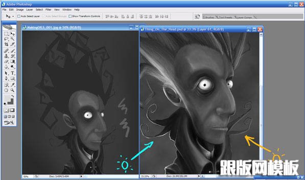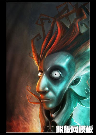 大体形状勾勒完毕以后,我开始考虑光源的方向。利用黑色与白色来体现,对于这幅作品,我希望在后面表现冷光,在前面是主光源为暖光。这是一个特别简单的方法,而且能表现出特别好的艺术效果。对于脸部,显得过于苍白,立体感不足,用半透明的的笔刷进行处理。笔触可以大一些,使得脸部皮肤更有质感。