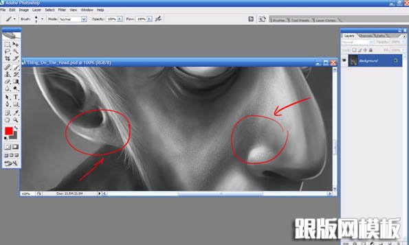 对于皮肤是应该有半透明的感觉,就像三维材质中的3S材质一样,会有部分透明。特别是在耳朵,鼻子部分的部分特别明显。在绘画的时候要注意体现。(如图4、图5)