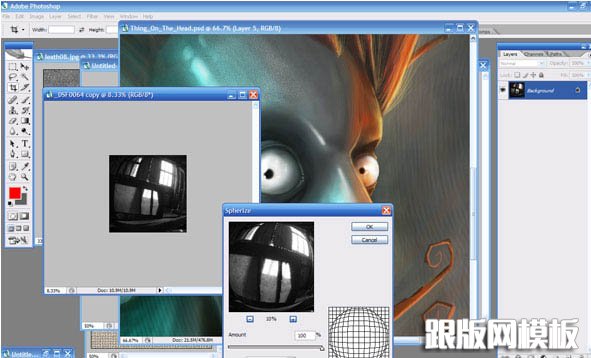上色完成以后,你就可以开始处理细节的问题了。我的方法是利用照片中现实的纹理效果。例如:衣服的衣领,我使用的是现成的纹理。无论是在柔光还是强光的范围都使用一张纹理素材,然后使用Photoshop的扭曲工具,将纹理素材扭曲能与需要覆盖部分的角度和大小。其他的纹理叠加也利用这样的方法。然后抹去多余的纹理的素材。(如图7、图8、图9)