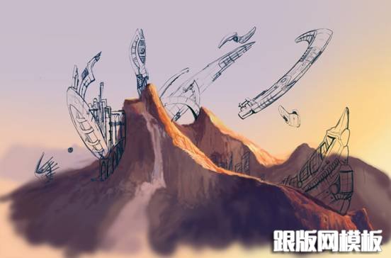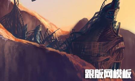 5、为场景中建筑大制作个设计,同时深入略靠近前景的环境细节,注意没有将这一步放在环境完成之后,是因为要想将建筑较好的融入环境之中,最好是将两者同时丰富塑造。