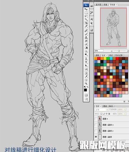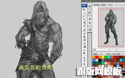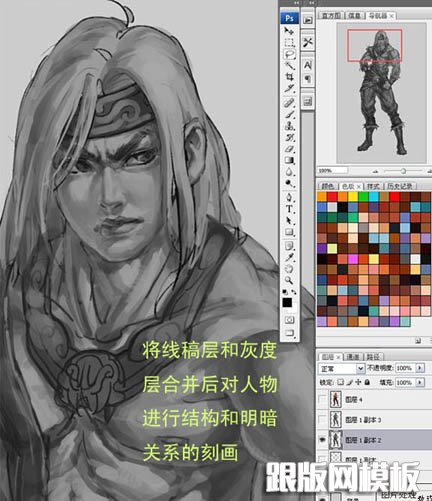 4、将线稿层和灰度层合并,对人物进行结构和明暗关系刻画。