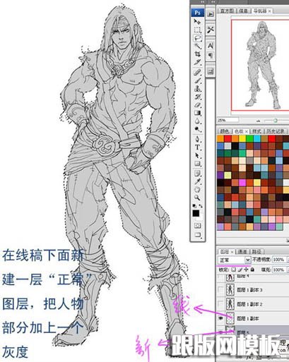 3、在线稿下面新建一个图层,把人物部分涂上灰色。