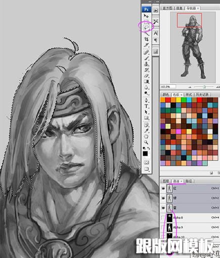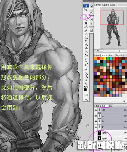 7、用套索工具来选择你想改变颜色的部分,比如皮肤部分,然后将通道保存,以后会用到。
