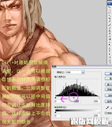 12、按Ctrl + L 对原始图层稍微调整,这一步可以根据你想画的材质来调整相应的数值。比如调整皮肤的时候可以把中间值向左调,让皮肤对比度降低。这样皮肤上不会出现太脏的颜色。