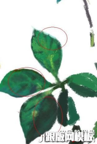 16、注意画圈的地方,边角可以用减淡工具高光模式打亮,叶茎用加深工具阴影模式加深,深色的地方最好不要使用纯黑色或纯某种色。