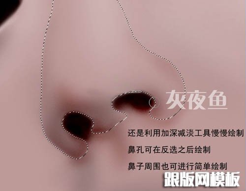 8、还是利用加深/减淡工具慢慢绘制,鼻孔可在反选之后绘制,鼻子周围也可进行简单绘制。