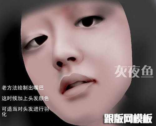 10、老方法绘制出嘴巴,这时候加上头发颜色,可适当对头发进行羽化。